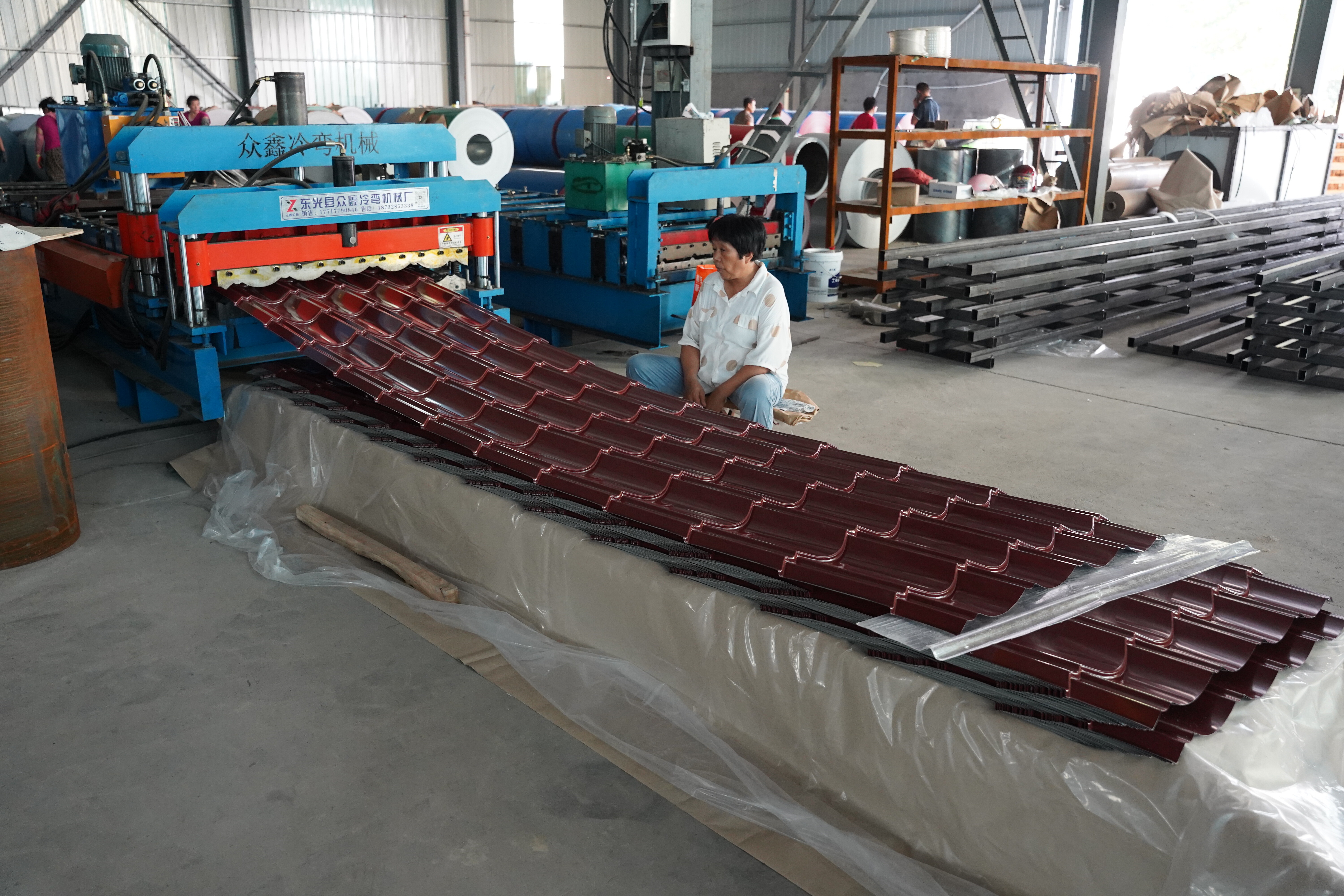 La ligne de production de tôles de toiture profilées prépeintes est un ensemble d'équipements automatisés qui transforme des plaques d'acier prélaquées en tôles profilées. Le processus général est le suivant : Les bobines de plaques d'acier prélaquées sont d'abord déroulées par une dérouleuse, puis redressées par une niveleuse pour assurer leur planéité. Ensuite, elles sont formées à froid en formes prédéfinies telles que ondulées et trapézoïdales par plusieurs séries de machines de profilage, puis coupées à la longueur définie, et enfin évacuées et empilées via un dispositif de convoyage.